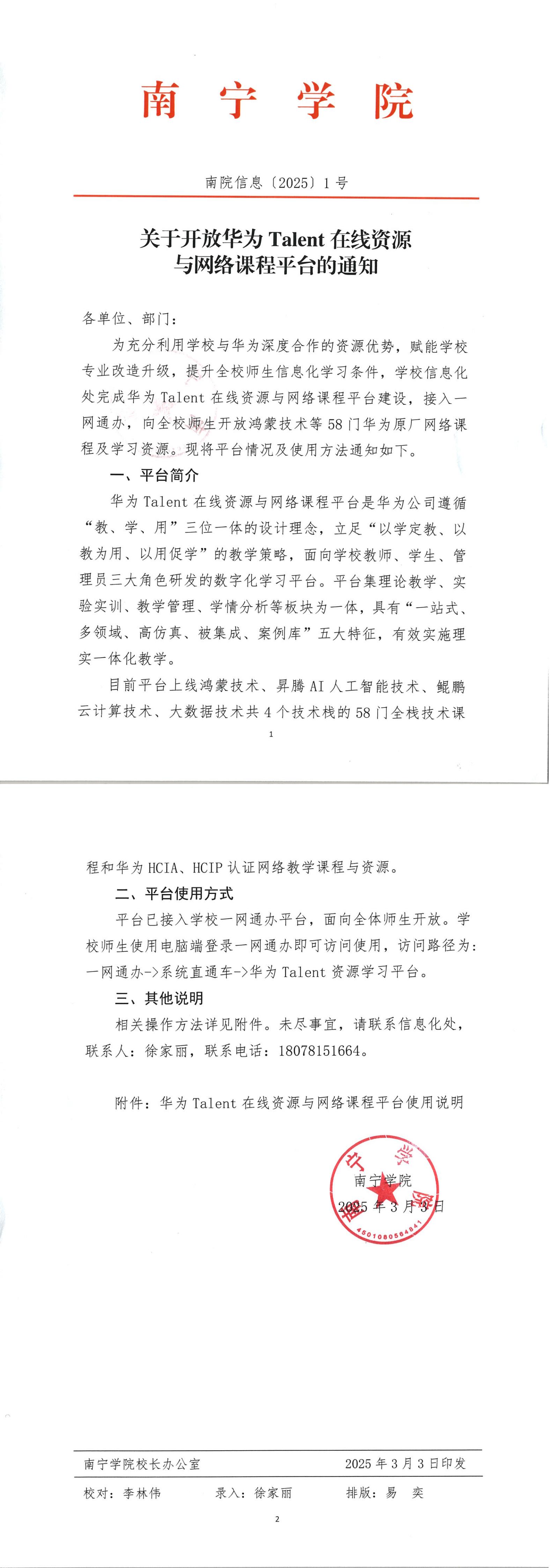 (南院信息〔2025〕1号)关于开放华为talent在线资源与网络课程平台的通知