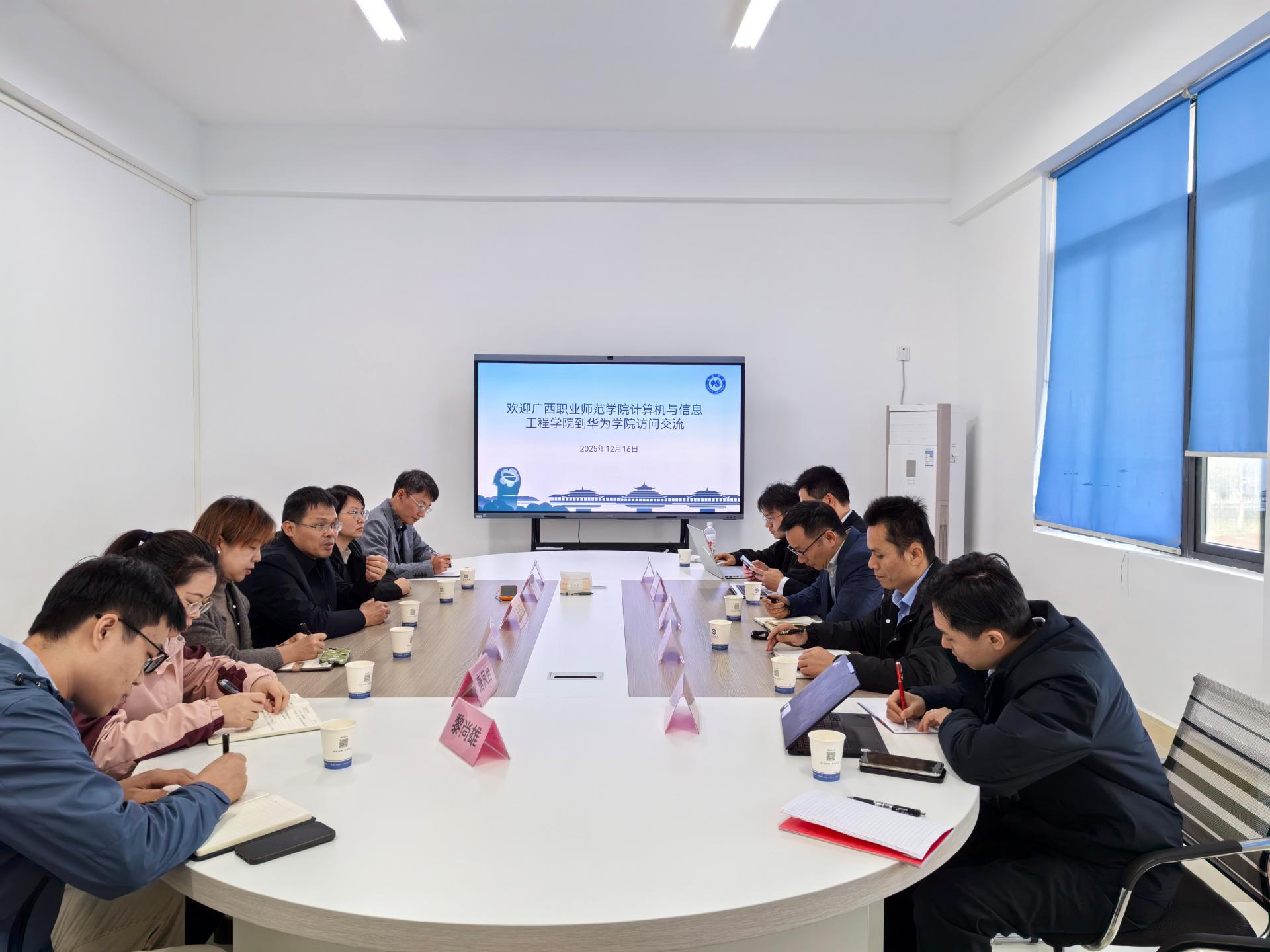 为深化产教融合、促进校际交流,2025年12月16日下午,华为数字技术产业学院接待了广西职业师范学院计算机与信息工程学院院长朱景锋一行6人,并在华为楼209会议室开展专题交流座谈会。双方围绕产业学院建设、人才培养模式创新、校企协同育人机制等议题进行深入交流。
