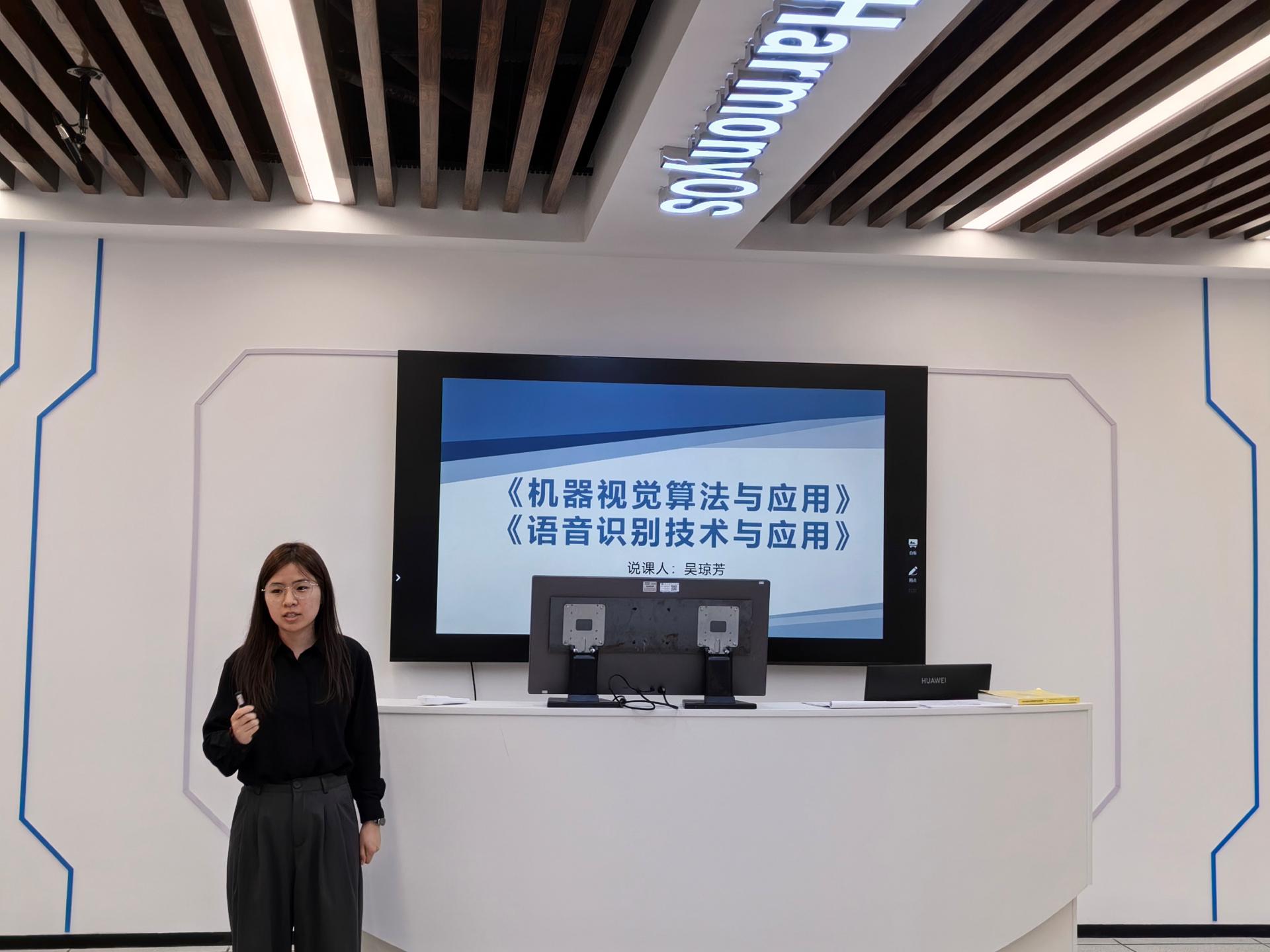 参加此次说课的是3位新入校的华为驻校工程师周明、吴琼芳、吴婷。在20分钟的说课展示中,他们结合华为最新认证标准和产业前沿动态,围绕学情分析、教学目标、重难点突破、教学过程设计及教学反思等方面进行了系统阐述,充分体现了学院“课证融通、工学结合”的办学特色。