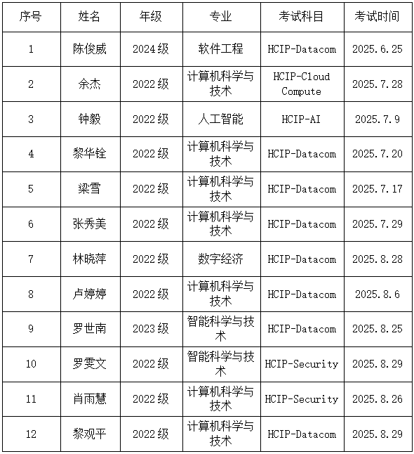 截至2025年10月10日,南宁学院陈俊威、余杰等12位同学通过华为HCIP工程师认证。